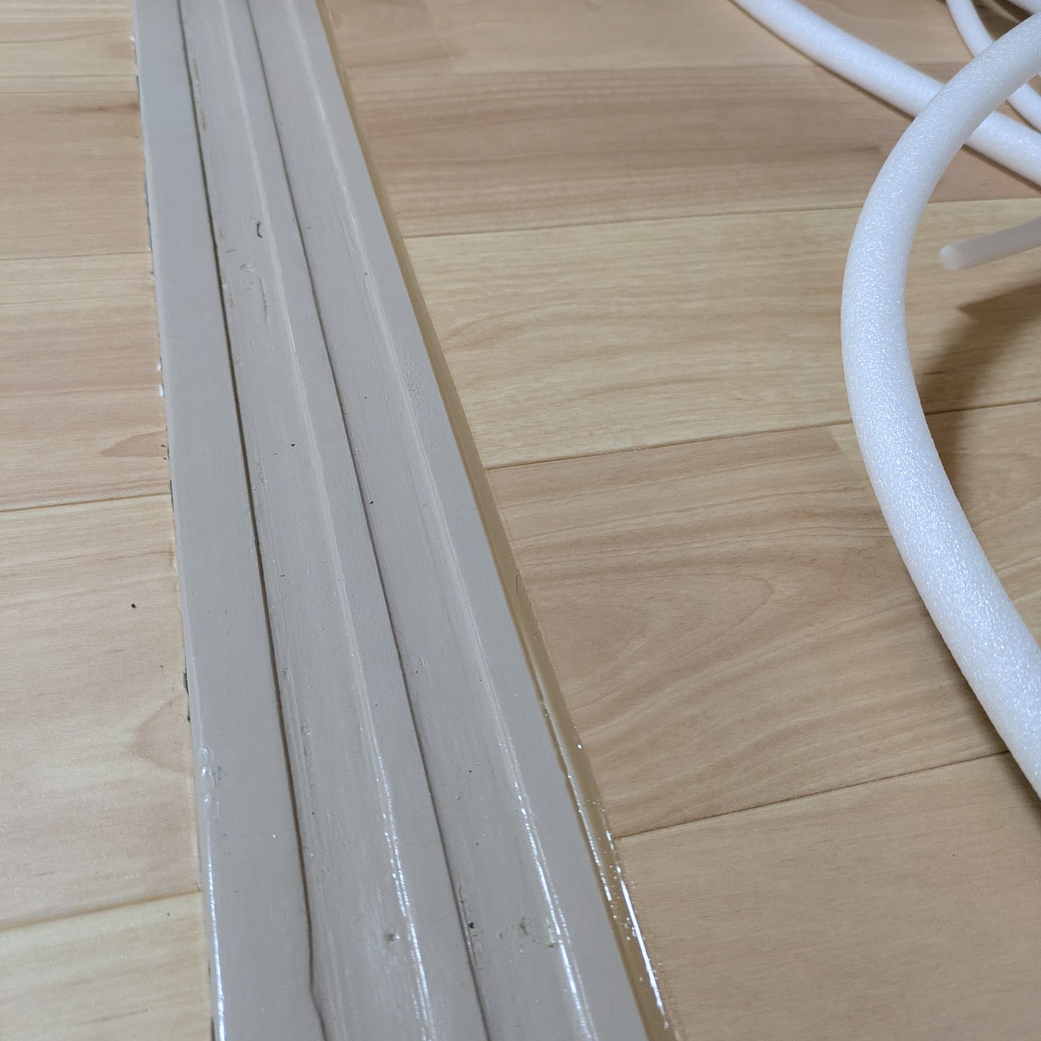 隙間が大きいところはバックアップ材というものを使います。これは棒状のスポンジです。隙間が大きいところは、いくらでもコーキングが入ってしまうのでバックアップ材を詰めておきます。